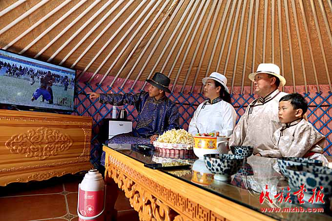 邊境牧區(qū)無(wú)線網(wǎng)絡(luò)暢通,阿巴嘎旗牧民伊拉勒?qǐng)D一家在觀看直播節(jié)目。
