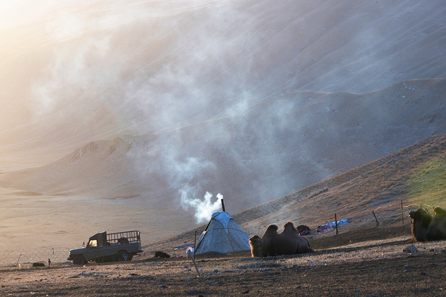 搬進城里之后,蒙古人多種擇業(yè)的可能和他們遠離草原以后的種種行為,很難與數(shù)千年蒙古人的歷史形象與定位相符。彭才一家的狀態(tài)與所用的氈包,讓我有一種久違的親切感。氈包和類似于氈包的種種信息,都在給你描述一種安適、踏實、畜糞煙火繚繞的氛圍。