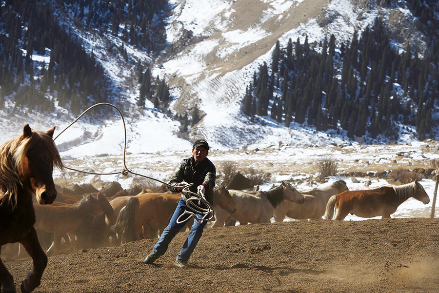 我首先到訪的是達楞達坂一帶。接待我的主人卡瑪儀表堂堂,60多歲還在照料自家的畜群。老人沒有興趣放羊,每天吆著100多匹馬和300頭牦牛在日月間往復。一望無際的雪原,把暴烈的馬群和野性難馴的牦牛吆往一個地方或再吆回去,騎馬的強度與奔跑的頻率遠不是他這個年紀的人所能駕馭的了。但老人不這么想,他不愿意在和靜縣城的暖氣房子里喝茶陪孫子們,而更愿意在他的馬背上,每天奔波在雪原上。