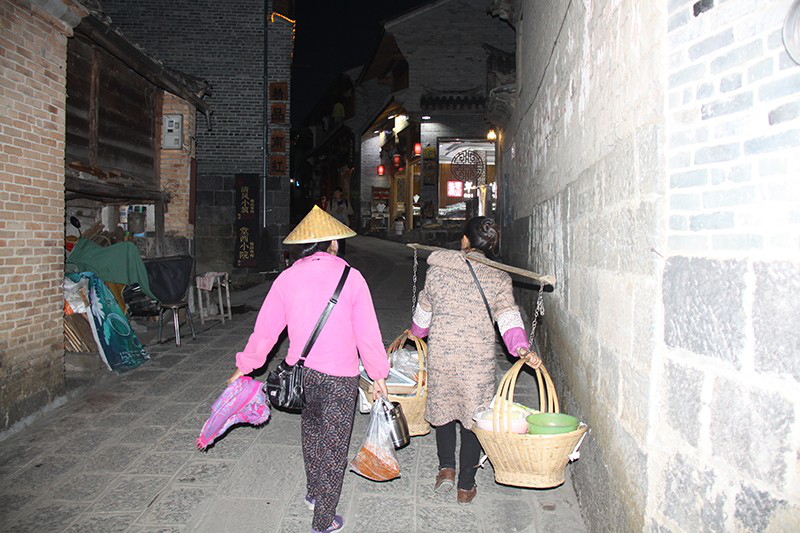 晚上7點多鐘,一群在小河里撲騰了一天的鴨子排著隊憨態(tài)可掬地回到寸家灣巷口,忙碌一天的人們也開始回家。我正擔心晚上約定的采訪找不到地方,卻在圖書館旁邊的小巷里碰到了收工回家的姜聰留。她今天的松花糕賣了一板半,收入100多元。同行的一個姐妹幫她挑著擔子,姜聰留自己提著袋子和板凳,一路無語。臨近家門的路口,姜聰留從姐妹肩上接過擔子,眼神默契相視后,各自回家——這就是她們的生活。晚飯姜聰留到丈夫的大哥家吃土鍋子,兩家的院子只隔一墻,我也跟著進了大哥江宗良的家門。