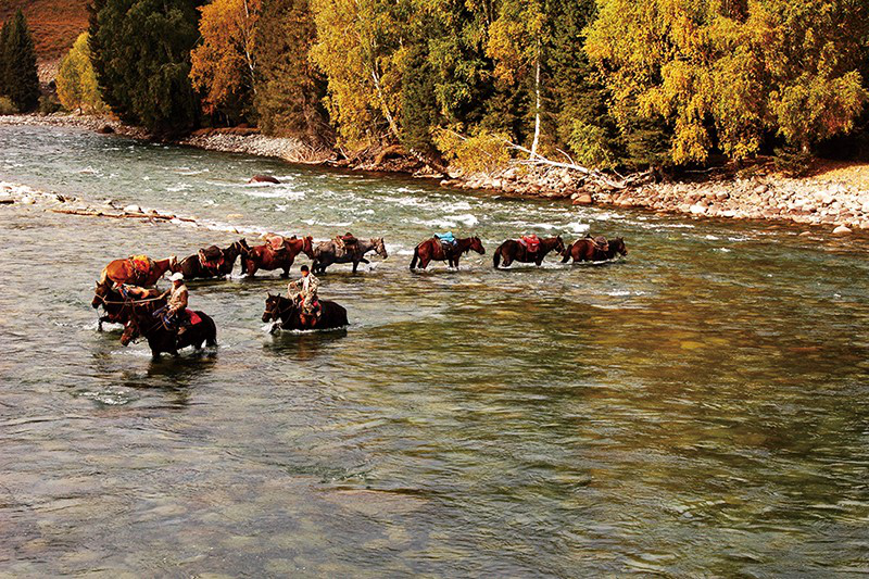 這時(shí)候,一位哈薩克族牧民騎著馬一邊往這邊走,一邊唱著歌??諘绲囊雇硪?yàn)橥蝗挥辛怂母杪暎幌伦颖惚淮蚱屏藢庫(kù)o和孤獨(dú)。他走到我跟前,從馬上跳下來(lái),愣愣地望著月光中的阿克哈巴河。我覺(jué)得他有點(diǎn)奇怪,怎么突然瞅著阿克哈巴河就發(fā)起了呆。過(guò)了一會(huì)兒,他表情復(fù)雜地看了我一下,然后轉(zhuǎn)過(guò)身去,準(zhǔn)備牽馬離去。