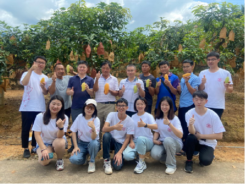 一是恩樂鎮(zhèn)復(fù)興村晚熟芒果基地調(diào)研。9月3日上午實(shí)踐團(tuán)前往恩樂鎮(zhèn)復(fù)興村晚熟芒果基地考察,了解該基地的主要栽培品種,提出當(dāng)?shù)孛⒐耘嗟膬?yōu)勢(shì)及目前亟需解決的問題,并為農(nóng)戶進(jìn)行相關(guān)栽培技術(shù)的講解,為當(dāng)?shù)赝硎烀⒐?xì)化管理提供技術(shù)支撐。同時(shí)實(shí)踐團(tuán)選取不同海拔生長(zhǎng)旺盛、豐產(chǎn)、穩(wěn)產(chǎn)的成年樹,隨機(jī)采摘果形均勻、健康飽滿、無機(jī)械損傷和病蟲害的成熟果,以及套上不同果袋子的果實(shí),如白袋、紅袋和黃袋,所有樣品采摘后立即送回實(shí)驗(yàn)室,對(duì)其單果重,果實(shí)縱徑、橫徑、厚度、總可溶性固形物、果形指數(shù)及風(fēng)味等綜合性狀進(jìn)行測(cè)定,探究不同海拔和果袋對(duì)芒果果實(shí)品質(zhì)的影響,以期為生產(chǎn)實(shí)踐提供理論指導(dǎo),提高果實(shí)品質(zhì)。