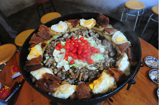 平壩凹鍋更具特色,食材十分豐富,為了拍攝平壩凹鍋小吃,我們一行來到當?shù)厝俗诎l(fā)英家開的勤發(fā)飯店,并被安排在二樓的里間。屋內(nèi)正中支著一口平底銅鍋,下面是燒著炭火的爐子?;鸷芡?,不一會平底鍋里的油便嗞嗞作響,主人把煎得黃黃的臭豆腐、豌豆粉等放到鍋里,鍋的中間加上一些蔬菜、小個西紅柿,色彩非常漂亮,周圍都放著一碗碗用噴香的辣椒面拌有濕蘸水和干蘸水。