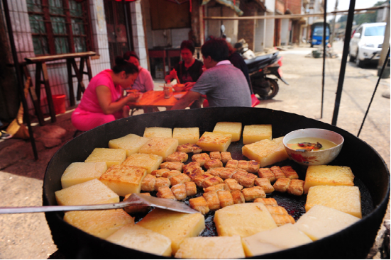 臭豆腐是平壩街的特產(chǎn),一直享譽滇東南。特別是在文山更是家喻戶曉。它火柴盒般大小,表皮長滿一層白白的絨毛。若是蒸吃,先揀幾塊鋪在碗底,再撒撮鹽巴,放點食油,加些姜絲,放進蒸鍋蒸熟。吃前用筷子攪和拌勻,看上去雪白,細嫩,宛若剛出籠的銀糕玉乳,散發(fā)出誘人的馨香。若用油煎,先將菜油舀進鍋里,待鍋熱時,立即放進臭豆腐。隨著“嗤”的一聲,香味立時撲鼻而來,再用小火耐心地將兩面煎黃,薄薄的黃皮內(nèi)含著一包乳漿??戳司妥屓舜瓜延?。