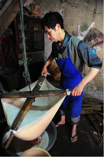 記者看到,主人開始磨豆子了,將泡好的豆子倒入機器內(nèi),一勺一勺的盛。并一邊磨一邊和我們交談,現(xiàn)在省事多了,以前都是推磨子的,而且制作工藝也十分講究。