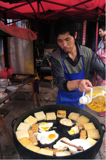 平壩的小吃,每一處都是風景。到天氣炎熱時,豌豆粉攤,煎了吃,還要涼拌著吃,吃到僅剩湯汁時,加上一點冷飯、拌勻而食,又是一番風味。