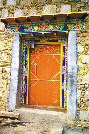 房屋大都是3層,上層存放干草和秸桿,下層關(guān)養(yǎng)牲畜,中間一層是居室。居室用木板隔間,里間較小是已婚子女住的,外間寬敞,是多功能堂屋。臨窗處設(shè)火塘,以利排煙,是家庭生活中心和待客之處?;鹛辽霞苤T大的鐵三角架,上面是六七厘米寬的鐵板圈,擦得錚亮,能烤制食物。墻角處供奉佛像,擺放領(lǐng)袖像。房門安設(shè)木鎖,用十幾厘米的木鑰匙開啟,都是由硬木刻制,光滑耐用。