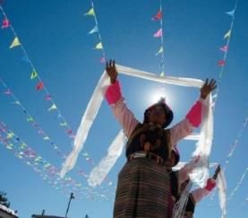 藏族自古崇尚白色,認(rèn)為白色是純潔、吉祥、誠摯、善良、正義和繁榮的象征。藏族崇尚白色由來已久,先民們把羊毛掛在門楣和各種器皿上;山口、要道的嘛呢石堆上放白色石頭;插箭祭“拉則”(山神的居所)時(shí),在箭桿上系白色羊毛等等,無處不見白色崇拜的印記,藏族居住的青藏高原人們習(xí)慣稱做雪域,作為最常見的景物伴隨著民族漫長的歷史,白色更自然地進(jìn)入藏民族的審美觀念中,滲入藏民族的靈魂深處。