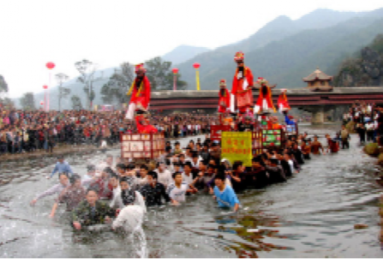 第二次是農歷正月十五日上午,分上、下半闕。上半闕仍依十四日走法,至過午一時許,古事列隊從“方龍橋”下河床。鼓樂隊先互相潑水透濕,然后三響神銃,古事棚蜂擁下水,逆水而走。除天宮一棚不能超越外,后棚超前棚,則視為吉利。于是抬夫拼力而為,爭先恐后,不顧天寒水深、河石苔滑,跌倒了再爬起,情緒異常高昂,至下午三時許,一年一度的走古事才在高潮中落下帷幕。