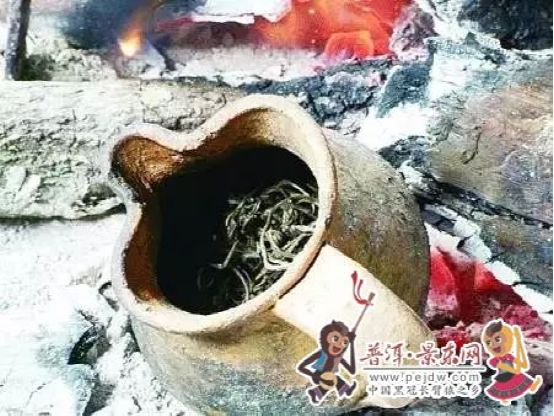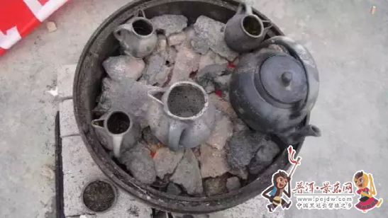 彝家糊米罐罐香茶烤罐要肚大口小,大小適中,茶具為土陶和紫砂制品為主。泡茶取無量山泉水,主要工序是用銅壺將水燒開,先將上好的糯米煎烤至黃,再將取于哀牢無量山的曬青白牙口茶放入抖烤。烤茶時要求“烤關(guān)百抖”,茶葉泛香糯米焦黃,糊米和茶葉烤好后,即沖入少量沸水,讓水自動沖除罐口浮沫,放入小片刨開的鮮姜,再加入開水煮一分鐘,即可入杯,奉給客人飲用。