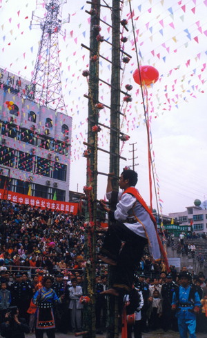 節(jié)日里,婦女們穿著鑲花邊的黑色上衣和點(diǎn)綴著各種銀飾物的花裙,佩戴耳環(huán)、項(xiàng)鏈等首飾,風(fēng)采奪人。男人穿著麻布短衣褲,腰系紅黃長帶,小腿系吊簡,腰佩長刀,肩挎箭包,英姿勃勃。節(jié)目的廣場上,堅(jiān)趄兩根二十米高的樹干,四周用藤蔓拉緊固定,樹桿上插有三十六把明晃晃的長刀,作為向上攀登的橫檔,刀刃向上,寒光逼人,謂之“刀竿午間。鞭炮齊鳴,鑼鼓震天”。身穿大紅抱、頭纏紅布包頭、赤腳的五名“玩火者”,齊涌至竿下,圍繞刀竿唱歌跳舞,將斟滿的白酒一飲而盡,縱身飛上刀竿。雙手緊提刀面,運(yùn)足氣的腳掌斜置在鋒利的刀刃上,勇敢、靈巧地向上攀登。全場鴉雀無聲,大家屏住呼吸仰面觀看,對他們的氣功絕技贊嘆不已。噼噼啪啪的鞭炮聲來自竿頂優(yōu)勝者,響徹云霄。全場歡呼跳躍,爭相向爬桿者敬獻(xiàn)美酒。對歌、跳舞、蕩秋千活動為節(jié)日增添了濃郁的氣氛。丟煙包(煙盒)活動別具一格,青年男女各站一方,互擲煙包,姑娘將小伙的煙包收藏起來,說明姑娘接受了小伙子的愛慕。