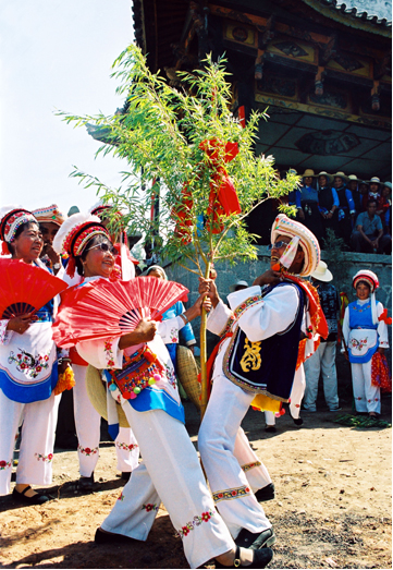 “繞三靈”活動(dòng)的特點(diǎn),除了向本主神靈祈求風(fēng)調(diào)雨順的內(nèi)容之外,主要在于其歌舞活動(dòng)所表現(xiàn)的男女情愛(ài)無(wú)所顧忌,放達(dá)不拘。每個(gè)歌舞隊(duì)列領(lǐng)頭者均為男女巫二人,他們以一手共執(zhí)一株齊人高的樹枝,另一手分別揮舞牦牛尾和花手巾,邊舞邊唱,引領(lǐng)著隊(duì)伍緩緩前行。樹枝上掛著紅綢系著的葫蘆,據(jù)說(shuō)葫蘆象征母腹,紅綢象征陰血。他們口唱的調(diào)子稱“活恩枯”直譯為“花柳曲”,一唱一和,幽默風(fēng)趣。其后的歌舞隊(duì)列,唱的也都是充滿艷情的調(diào)子,跳的是霸王鞭和八角鼓舞,舞姿多有男女背靠背、心合心、腳勾腳等形式,無(wú)拘無(wú)束地表達(dá)著熾熱的情感。