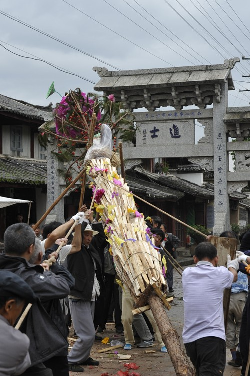 在劍川,都是由家里喜添子嗣的人家來(lái)籌備火把節(jié)的一切事宜,除了對(duì)新生兒的祝福,火把樹的裝扮也表示劍川人祈愿風(fēng)調(diào)雨順,人壽年豐、鄰里和諧?;鸢岩樱ㄩc年要扎十三層),上面六層的明子和柴分別由細(xì)到粗,一層接著一層,下面七層都是一樣的新柴。喻示每一個(gè)新的日子都紅紅火火。