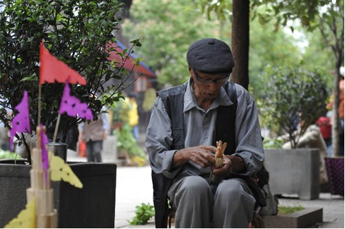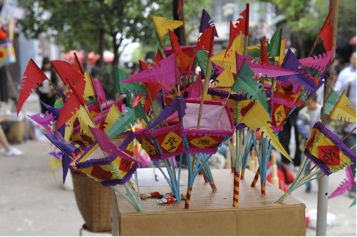 早上十點(diǎn)左右,火把就快扎好了。色彩鮮艷的紙裱斗升上各色卷著的彩旗正一個(gè)個(gè)被打開,梨、蘋果、花紅正被栓成一串串地掛在樹枝上,水泥桌上擺著小旗、炒蠶豆和糖果等,老人們?cè)谝慌赃呅吜模槐P彩色米干在燦爛的笑著。