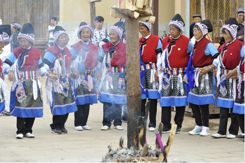 到了這一天,親友鄰居都不請(qǐng)自到來(lái)幫忙和祝賀。綁扎柴禾,做小彩旗,栓水果串等,等一切都好,再齊心合力豎起火把。等掛著果串的斗升一點(diǎn)點(diǎn)離開地面,火把樹穩(wěn)穩(wěn)當(dāng)當(dāng)挺立的時(shí)候,孩子的奶奶和外婆就在火把樹下燃起香,敬上茶酒和米干,虔誠(chéng)地磕頭祈禱。