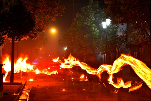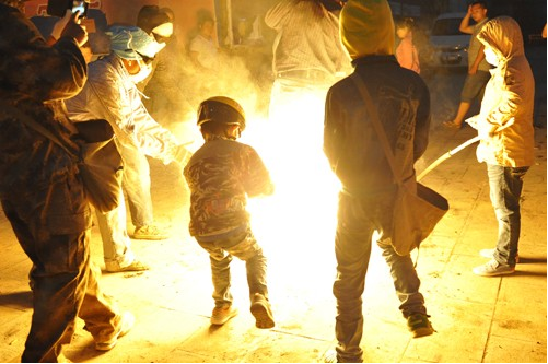 不到黃昏,鞭炮聲就響起來(lái)了。新生兒的父親點(diǎn)燃火把后,孩子們迫不及待地拿著小火把和松明粉,跑來(lái)跑去燒新生兒的的各種親戚,大人們樂(lè)呵呵地接受孩子們噴灑過(guò)來(lái)的火焰,并一致說(shuō)著很吉祥的祈愿祝福語(yǔ)?!皬拇嘶逇獠辉趪D!”、“一年更比一年好呀!”、“紅紅火火又一年”。男女老少在火把樹下吃喝玩樂(lè),其樂(lè)融融。糖、炒蠶豆、梨、蘋果等被大家傳來(lái)傳去,新生父親挨個(gè)向親友敬酒。親友鄰居喝著喜酒,一致祝福新生兒安康成長(zhǎng),將來(lái)富貴吉祥。