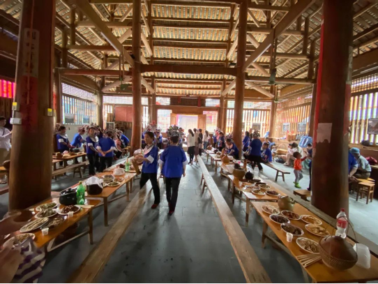 “百家宴”是侗族待客的最高禮儀。每逢村寨互訪或有特別尊貴的客人來時(shí),全村各戶自備酒菜飯,一起到鼓樓坪“一”字型擺開長桌,客人可從第一桌吃到最后一桌,你來我往、觥籌交錯(cuò)、熱鬧非凡。據(jù)說在當(dāng)?shù)亓鱾髦@樣一個(gè)說法:“吃百家飯、納百家福、聯(lián)百家心、驅(qū)百家邪、成百樣事、享百年壽”——各寨