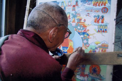 嘎瑪噶赤畫(huà)派,屬西藏東部地區(qū)畫(huà)派。相傳由郎卡扎西所創(chuàng),與其同時(shí)期的八世噶瑪巴米久多吉,奠定了嘎瑪噶赤畫(huà)派的理論基礎(chǔ)。十六世紀(jì),嘎瑪噶赤畫(huà)派開(kāi)始盛行康區(qū),先后涌現(xiàn)出了一批大師。嘎瑪噶赤畫(huà)派在發(fā)展過(guò)程中,由于生存地域與漢地緊密相連,在政治、經(jīng)濟(jì)、文化上的交往也相對(duì)頻繁,尤其在繪畫(huà)方面,多受漢地明代以后工筆重彩畫(huà)和四川綿竹木版年畫(huà)的影響。嘎瑪噶赤畫(huà)派在嚴(yán)格繼承傳統(tǒng)繪畫(huà)的基礎(chǔ)上大膽創(chuàng)新,吸收漢族畫(huà)家工筆重彩之精華,注重抒情寫(xiě)意之風(fēng)格;講究色彩對(duì)比,結(jié)構(gòu)嚴(yán)謹(jǐn),畫(huà)工細(xì)膩,最后達(dá)到精美絕倫之境界。其總體風(fēng)格形成了有別于衛(wèi)藏地區(qū)門(mén)唐、欽澤兩大畫(huà)派的特征。二十世紀(jì)初,噶瑪噶赤畫(huà)派藝術(shù)更為完善和成熟。
