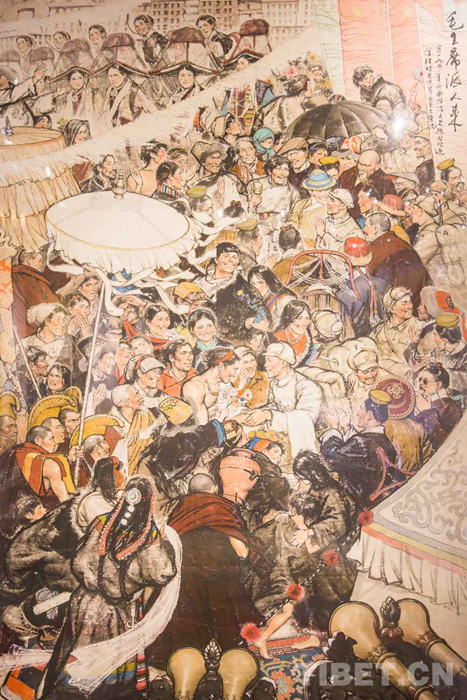 鑒賞展現(xiàn)場,不少前來參觀的畫家都是韓書力的學(xué)生或在一定時期曾受其教導(dǎo)。“1973年,我在西藏自治區(qū)展覽館見到了韓書力老師,第一次見面我就拜了師。我們一起下鄉(xiāng),我就給他當(dāng)導(dǎo)游和翻譯。30幾年來,我一直在學(xué)習(xí)韓老師的繪畫技法,到現(xiàn)在還是他的學(xué)生。韓老師創(chuàng)作《毛主席派人來》時,我就跟在旁邊學(xué)習(xí)。學(xué)到了一些創(chuàng)作獨(dú)幅作品的技巧和手法,讓我受用至今?!蔽鞑厍嗄戤嫾矣嬅莱嗔姓f。