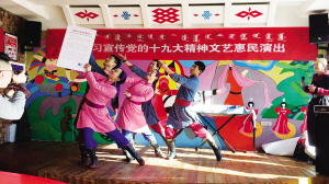 2017年12月6日,察右后旗烏蘭牧騎赴白音察干鎮(zhèn)白音淖爾嘎查進(jìn)行黨的十九大宣傳慰問演出。圖為舞蹈《總書記回信了》。