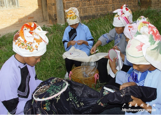廣南刺繡歷史悠久,遍及壯鄉(xiāng)苗嶺,瑤山彝寨,街頭巷尾,處處都是刺繡的天地。壯族青年婦女的頭飾、圍腰心、圍腰頭、高綁布鞋要繡上圖案裝飾,兒童戴的貓頭帽、花風帽、燕尾帽、月牙帽繡有花邊絲綢,帽前鑲有十八羅漢銀器像,帽的左右兩邊掛有兩串銀器以示吉祥,壯族婦女的外衣繡有三角形、四方形花紋圖案,廣南壯族人民使用的生活用品,如被套、枕巾、桌布、窗簾、手帕以及婦女背小孩的背帶、兒童披風和靈芝鞋等都要繡上花鳥小草點綴,體現(xiàn)出美的情致。