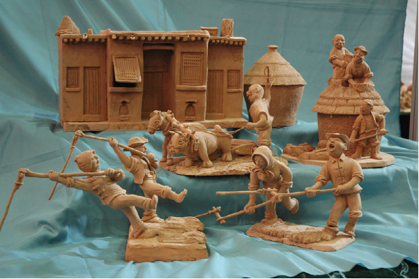 泥塑藝術是我國一種古老常見的民間藝術。它以泥土為原料,以手工捏制成形,或素或彩,以人物、動物為主。不同的民間風俗,流傳著很多動人的傳說故事,這些構成了泥塑藝術的精神內(nèi)核。民間泥塑的用途主要有祈子延壽、納福招財、驅邪避災和裝飾擺設等。泥塑成本低,費工少,是老百姓喜聞樂見的藝術表現(xiàn)形式,它往往和節(jié)令、禮儀、風俗聯(lián)系在一起,反映的是當?shù)剞r(nóng)村人們?nèi)粘I畹牟煌瑘鼍埃宋镨蜩蛉缟?,場景鮮活生動。