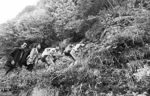 教師楊紹書和學(xué)生們?cè)谘卤谏系男÷沸凶摺?/span>