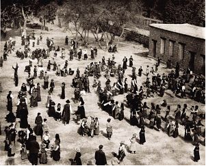 1948年,拉薩小學校長邢肅芝(左起第七腰間佩槍者)應邀赴尼泊爾訪問前與學校教職員及部分家長合影留念