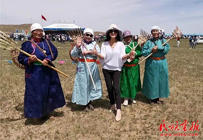 王金梅在錫林郭勒草原的夏季那達慕上體驗?zāi)撩裆睢?/span>