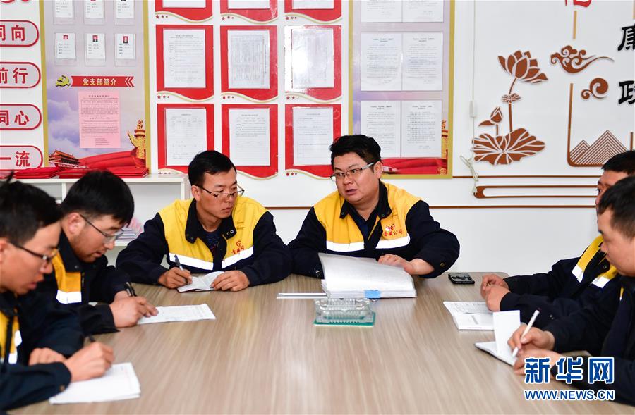 1月11日,在青藏鐵路望昆站,于本蕃(左三)帶領(lǐng)工友在鐵道上施工。(新華社記者張龍 攝影)