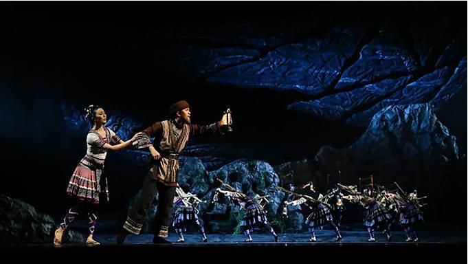 “花腰帶”既是精美的舞蹈道具,又是劇中人物情感的寄托,在整部舞劇中反復(fù)出現(xiàn)。特別是在雙人舞中,“花腰帶”將人物間無形的關(guān)系幻化成有形的聯(lián)系。劇中的蘆笙舞段,不僅僅是男女之間情愛的表達(dá),更突出表達(dá)了“開山人”為了讓窮鄉(xiāng)告別貧苦,為大愛舍小愛、努力奮斗的決心,以及對(duì)美好生活的向往。傳統(tǒng)民族舞蹈在這部劇中被賦予了不同的含義。
