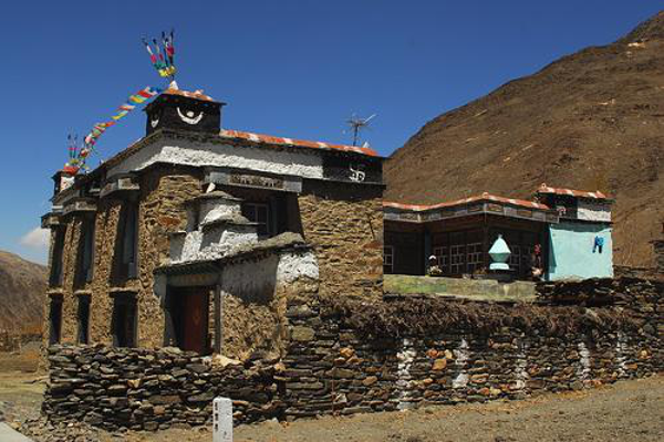 碉房是藏族很具代表性的民居之一,多為石木結(jié)構(gòu),外形端莊穩(wěn)固,風(fēng)格古樸粗獷。碉房一般有三到四層。底層養(yǎng)牲口和堆放飼料、雜物;二層布置臥室、廚房等;三層設(shè)有經(jīng)堂。由于藏族信仰藏傳佛教,誦經(jīng)拜佛的經(jīng)堂占有重要位置,神位上方不能住人或堆放雜物,所以都設(shè)在房屋的頂層。為了擴(kuò)大室內(nèi)空間,二層常挑出墻外,輕巧的挑樓與厚重的石砌墻體形成鮮明的對(duì)比,建筑外形因此富于變化。
