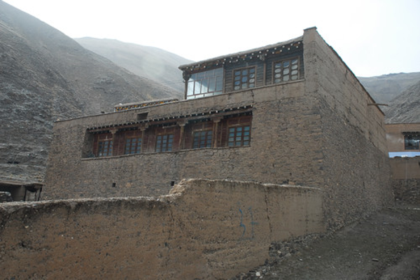 “碉院”則是一組較大的綜合性建筑,一般三層,局部四層,平面為四全院式,中間有較大的天井內(nèi)院,設(shè)小花壇,可種樹木花卉。內(nèi)院四周設(shè)回廊,石砌外墻用全封閉,除了門洞,墻上開少量小窗。底層為牲畜圈、雜用房;二層多為倉(cāng)庫(kù)、接待房、傭工房等;三層為臥室、廚房和糧倉(cāng)、珍寶庫(kù);四層為經(jīng)堂、佛堂、經(jīng)書庫(kù)。有的在外墻女兒墻部分刷以黑色或棕色圓珠圖案,窗上檐一層或二層方椽挑出,作為傳統(tǒng)式藏窗形式,豐富了立面,改變了石墻面之笨拙感。
