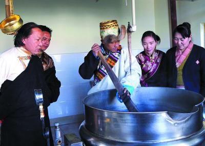 該遺產項目代表性傳承人明珠(左)指導瀧沐覺堪(制藥師)煎熬“五味甘露”。關確才讓 攝