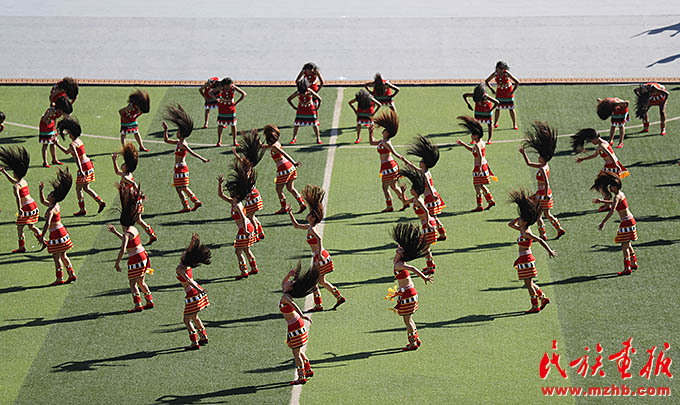在國旗、會旗、會徽和彩旗方陣的引領(lǐng)下,來自全省16個州市、云南民族大學(xué)和云南師范大學(xué)的18個代表團按順序依次入場,每個代表團都獻上了別具特色的民族歌舞表演,整個入場式載歌載舞,氣氛歡快熱烈。在雄壯的國歌聲中,中華人民共和國國旗和云南省少數(shù)民族傳統(tǒng)體育運動會會旗先后冉冉升起,飄揚在世界佤鄉(xiāng)、大美臨滄的藍天下。