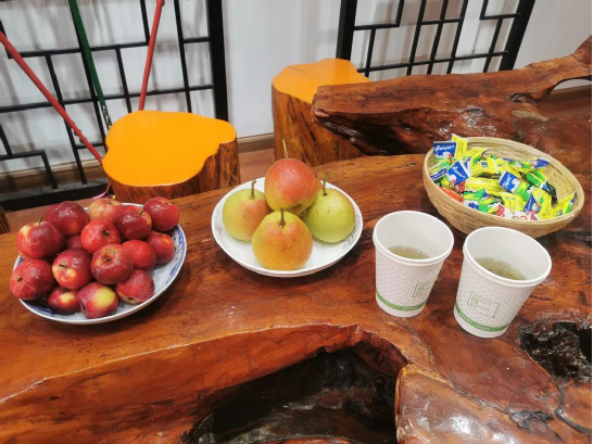剛踏進(jìn)傳習(xí)所,就見何松康老師已準(zhǔn)備好茶水以及時(shí)下最新鮮的花紅、梨子等水果候著我們到來了。對于每一位來到傳習(xí)所了解白族霸王鞭文化的訪客,她都熱忱相待。