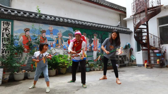 何松康將霸王鞭打法傳承給兒媳(右一)及孫女(左一)▲
