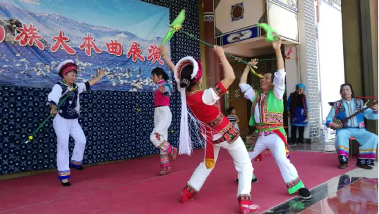 慶洞村有一支白族繞三靈文藝隊(duì),全都由村里的文藝愛好者組成,何松康是文藝隊(duì)的主力?!叭?duì)20多人,霸王鞭都是我?guī)С鰜淼?,都可以算作我的徒弟,平時(shí)沒事大家就一起練習(xí)表演,有活動(dòng)了就一起參加活動(dòng),傳承傳統(tǒng)文化的同時(shí),還可以補(bǔ)貼一點(diǎn)收入”,何松康說。