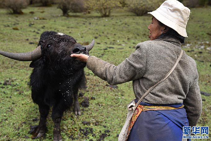 卓嘎在山上喂牛