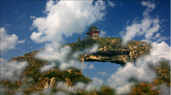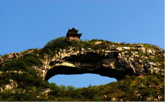 仙橋山位于貴州甕安縣城西南5公里的仙橋村,雄峙于南北伸展的長嶺之巔。山頂有一長方形穿洞,遠望似一面中天明鏡,又若仕女發(fā)髻上的一匹玉簪。民間傳說,那高懸的“橋洞”,是神通廣大的仙人張三豐發(fā)怒時一拳擊穿的。站在“橋”下仰望“橋”頂,如巨粱橫亙天際,青崖黛壁,輝映云天。天衣無縫的“橋身”和兩邊的“橋墩”,渾然一體,構(gòu)成跨度約40米,寬20米,高約35米的“橋拱”?!皹蚬啊北泵娴摹皹蚨铡蹦_有形狀各異的石洞,曲徑相通。洞壁有形似人腳印石凹,傳說是仙人張三豐到此云游留下的足跡。
