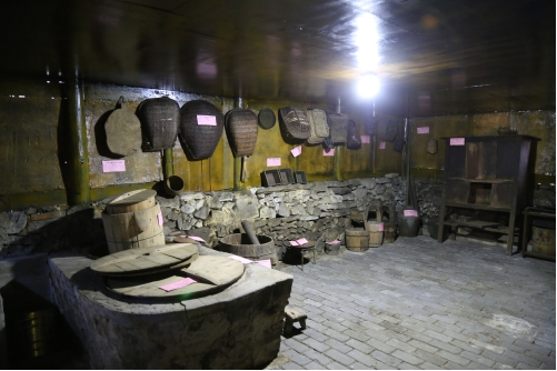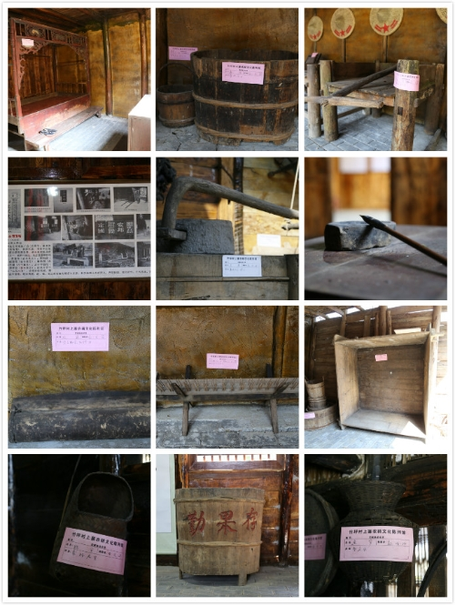 “農(nóng)耕文化陳列館”是由兩棟傳統(tǒng)的木質(zhì)民房改建,從大門進(jìn)來,門的兩邊放置有農(nóng)具,右側(cè)一個(gè)是存儲(chǔ)糧食的倉(cāng)庫(kù),沿著倉(cāng)庫(kù)邊上的石階往上走,從小門進(jìn)去,大大小小的簸箕、飯甑、貓籮、魚籮等農(nóng)具應(yīng)有盡有。