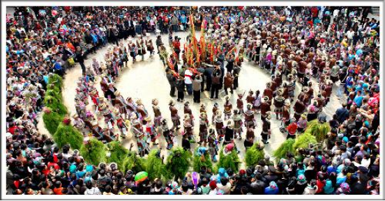 蘆笙踩堂開始時,首先舉行開堂儀式,向蘆笙柱祭祀。蘆笙柱是苗族的圣物,用高達10米以上的完整杉木制作而成,柱頂立一只錦雞(苗族崇拜的一種鳥),雞頭向東,寓意吉祥;柱身盤著一條金龍,體現(xiàn)苗族與漢族的文化融合;還有苗族崇拜的牛角和十字架。寨老和蘆笙頭分別敬上三杯酒和燒三柱香,感謝神靈和祖宗保佑,祈求坡會成功、新年萬事如意。緊接著,蘆笙頭拿起小蘆笙,圍繞一個曲調(diào)反復吹三遍,拉開蘆笙踩堂表演的序幕。