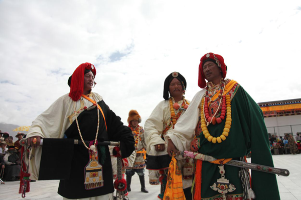 藏族分布在全國五省區(qū),因氣候、環(huán)境的不同,形成了豐富多彩的服飾文化。藏族服飾有“隔山兩個樣的”說法,有人統(tǒng)計,因地域、男女、年齡、婚否和季節(jié)的不同,藏族服飾有100多種。男裝各地大同小異,上身穿寬大的藏袍,袖長及膝。束各種腰帶。寬大的藏袍非常適應青藏高原多變的氣候,露出右臂便于勞作,天熱時將脫掉兩袖,將藏袍扎在腰間,天冷時套上雙袖。西藏人的服飾樣式很多,有衛(wèi)藏類服飾、康巴類服飾、安多類服飾和拉薩裝。衛(wèi)藏主要指除昌都地區(qū)以外的西藏大部分地區(qū)。西藏大部分地區(qū)的男裝,主要衣料是氆氌,城鎮(zhèn)人多穿黑色,農(nóng)牧民多穿白色。康巴主要指西藏的昌都和青海的玉樹、果洛一帶。男子多內(nèi)穿右襟齊臍短襖,外罩圓領寬袖長袍。頭戴狐皮帽或“扎秀”(發(fā)辮纏紅絲線),扎腳穿高筒靴顯得英俊瀟灑。女子穿長袖衫,外罩坎肩,腰束彩條圍裙。講究腰帶和腰刀,腰帶和腰刀上要鑲嵌金銀珠寶。女子多戴名貴飾品,顯得華麗昂貴。安多藏區(qū)主要指西藏那曲與安多縣接壤的地方。過去,男裝衣領、袖口,下擺多飾虎豹皮,女裝邊飾多為水獺皮,而且項、腕、手指和腰間配有金銀寶石飾物。