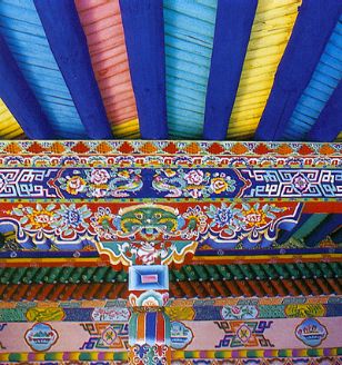 柱頭裝飾包括柱頭、斗拱、大梁等部位的雕刻、彩繪。在藏族居室中柱子、橫梁位置顯要,因此對(duì)這部分的裝飾在整個(gè)室內(nèi)裝飾中至關(guān)重要。無(wú)論高雅精致的殿堂還是普通百姓的民居都充分認(rèn)識(shí)到這一點(diǎn),進(jìn)行合理裝點(diǎn)以求莊嚴(yán)、堂皇、舒適的效果。就拿寺廟集會(huì)大堂的柱頭、橫梁來(lái)講,裝飾十分考究。天花板下的椽子木頂端整整齊齊地、略有間隔地排列在大梁上方,用彩繪的辦法進(jìn)行裝點(diǎn)。椽子至大梁之間夾著兩道橫杠,其上道用累卷疊函凹凸方格木雕處理,下道橫杠用蓮花瓣依次排列的雕刻或彩繪完成,這種裝飾是約定俗成的,上下圖案不能隨意調(diào)換。橫梁上的裝飾大多采用填充連接長(zhǎng)方格來(lái)進(jìn)行。橫梁表面劃分大小等同的長(zhǎng)方格,這些連接的長(zhǎng)方格內(nèi)或填寫梵文經(jīng)文,或繪各種花卉,用這樣的手段裝飾大梁。柱頭與橫梁之間是斗拱,藏族建筑對(duì)斗拱的裝飾非常講究。斗拱分兩層,上為長(zhǎng)弓,下為短弓。斗拱長(zhǎng)短兩弓本身形狀要精心雕摟,其表面也用雕刻著色的辦法加以渲染,以求良好的裝飾效果。斗拱裝飾有簡(jiǎn)有繁,最簡(jiǎn)單的斗拱形狀為梯形,這種不加任何雕飾的斗拱多見于底層的儲(chǔ)存室內(nèi)。而寺廟建筑大堂、佛堂之類重要殿堂內(nèi)的斗拱是經(jīng)過(guò)精心雕鏤的藝術(shù)品,尤其是斗拱長(zhǎng)弓形狀千姿百態(tài),通常見得較多的有祥云狀,此外還有各種花瓣?duì)?,其裝飾效果相當(dāng)強(qiáng)。除了斗拱形狀的雕刻外,表面上雕刻各種圖案獲得錦上添花的效果。長(zhǎng)弓中心雕刻佛像,兩邊及邊緣雕刻祥云、花卉、整個(gè)斗拱表面顯得飽滿、大方。柱子、柱頭也是裝點(diǎn)的一個(gè)良好的空間,柱子形狀有圓有方,也有部分多角柱。柱子最上面的部位或雕或繪花瓣,在下是長(zhǎng)城箭垛式圖案,這兩樣圖案的下面是短簾垂鈴式圖案,所有柱頭裝飾圖案基本上按此模式制作。除了雕鏤精細(xì)的寺廟大殿柱頭大梁裝飾以外,大量的柱頭裝飾見于藏族民居室內(nèi)。民居室內(nèi)柱頭大梁裝飾的基本走向、風(fēng)格與寺廟裝飾設(shè)有大的區(qū)別,彩繪圖案、顏色運(yùn)用、布局結(jié)構(gòu)除了個(gè)別外,與寺廟裝飾相同,只是民居室內(nèi)柱頭大梁裝飾多半是彩繪,幾乎見不到雕刻,這是經(jīng)濟(jì)條件所限呢還是等級(jí)待遇不同不得而知。兩者除了裝飾上的簡(jiǎn)繁區(qū)分之外其余部分很好地保持了藏民族建筑風(fēng)格的一同性。
