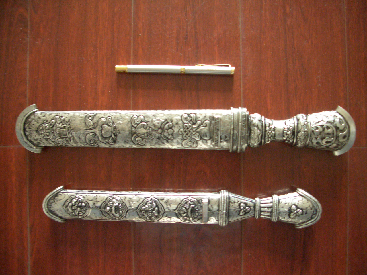 藏刀具有生產(chǎn)、生活、自衛(wèi)、裝飾4種用途,已有1600多年的生產(chǎn)歷史,做工講究,刀身用鋼材鍛,刀柄用牛角或硬質(zhì)木料加工而成。從規(guī)格尺寸上分,藏刀大致為長(zhǎng)刀、短刀和小刀三種。長(zhǎng)刀最長(zhǎng)的有一米多,短刀約40厘米左右,小刀則僅有十幾厘米長(zhǎng)。從形狀上講,具有很強(qiáng)的地方特色,有牧區(qū)式、康巴式、后藏式等區(qū)別;用途也有很多種,如林區(qū)砍樹(shù)有專門(mén)的砍樹(shù)刀,屠夫用的屠宰刀等。 藏刀把多用以牛角、牛骨或木材制成,較高檔的刀把用銀絲、銅絲等纏繞,刀鞘則更為講究,較簡(jiǎn)單的有木鞘或皮套外,多數(shù)是包黃銅、白銅,甚至包白銀、鍍金等,上面刻有精美的飛禽走獸及花草等各種圖案,有的還鑲嵌各種寶石、彩石,顯得華麗和富有。拉孜生產(chǎn)的藏力,歷史悠久,樣式美觀,淬火適中,刀刃鋒銳,再配上精致、貴重的刀鞘,雕著龍、鳳、虎、獅和錦花圖案,精美的藏刀大都出自能工巧匠之手。由于鍛打精致,鐫刻細(xì)膩,色彩奪目,并附有藏文,系有五顏六色柄穗,形成別具一格的藏族工藝品。藏刀的主要加工材料有銀、銅(白銅、黃銅、紫銅)、鐵、鯊魚(yú)、牛角、瑪瑙、硬雜木等。過(guò)程有冶煉熔化、模具翻鑄、敲摳大形、刻花鑲嵌、焊接組合、加固、銼磨整形、精雕細(xì)刻及鎂洗拋光等工序。